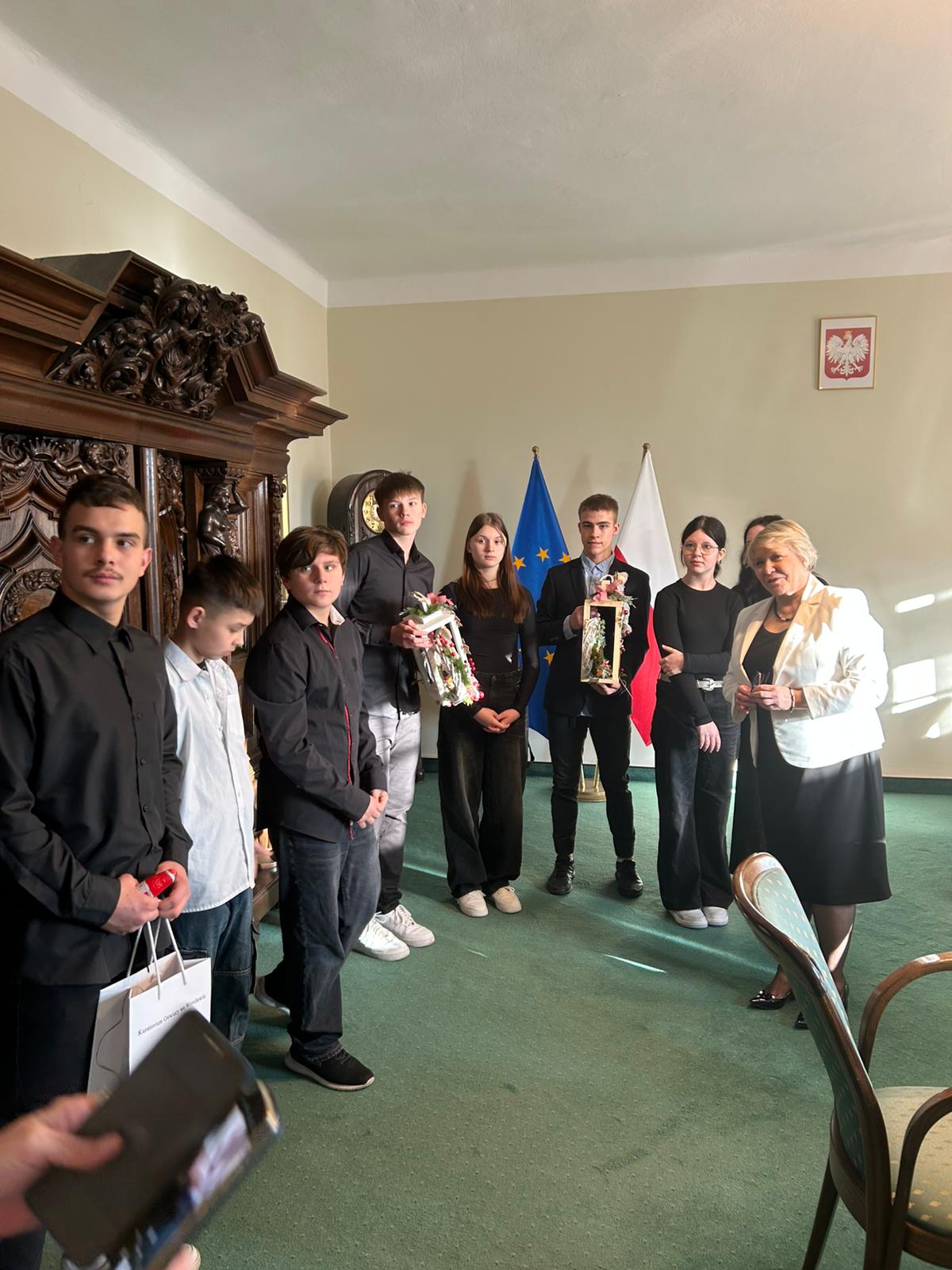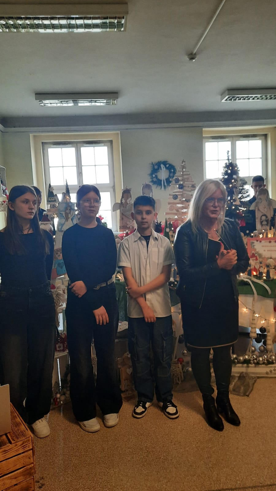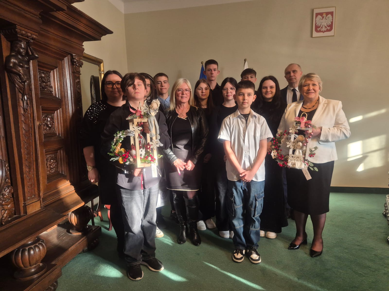 Uroczystemu otwarciu wystawy towarzyszył występ muzyczny. Wychowanki i wychowankowie zaprezentowali kilka utworów świątecznych, do wspólnego śpiewania których chętnie włączyli się wszyscy obecni goście, tworząc niezwykle serdeczną i radosną atmosferę. Po bardzo miłym przywitaniu przez Panią Marię Szymerowską, młodzież wraz z opiekunami została zaproszona przez Dolnośląską Kurator Oświaty, Panią Ewę Skrzywanek, do jej gabinetu. Podczas spotkania wychowankowie opowiedzieli Pani Kurator oraz Wicekuratorowi, Panu Dariuszowi Wójcikowi, o swojej pracy, zaangażowaniu oraz o wolontariacie, który w ich placówkach odgrywa niezwykle ważną rolę w procesie wychowawczym. Warto podkreślić, że środki pozyskane ze sprzedaży prezentowanego rękodzieła zostaną w całości przekazane na cele charytatywne, co nadaje całemu przedsięwzięciu szczególną wartość i sens. Pani Kurator podziękowała młodzieży za zaangażowanie, wrażliwość i piękną inicjatywę, a na zakończenie spotkania wręczyła wszystkim słodkie upominki. Anielska wystawa w Kuratorium Oświaty we Wrocławiu była nie tylko prezentacją talentów artystycznych, lecz także pięknym świadectwem empatii, współpracy i chęci niesienia pomocy innym.
