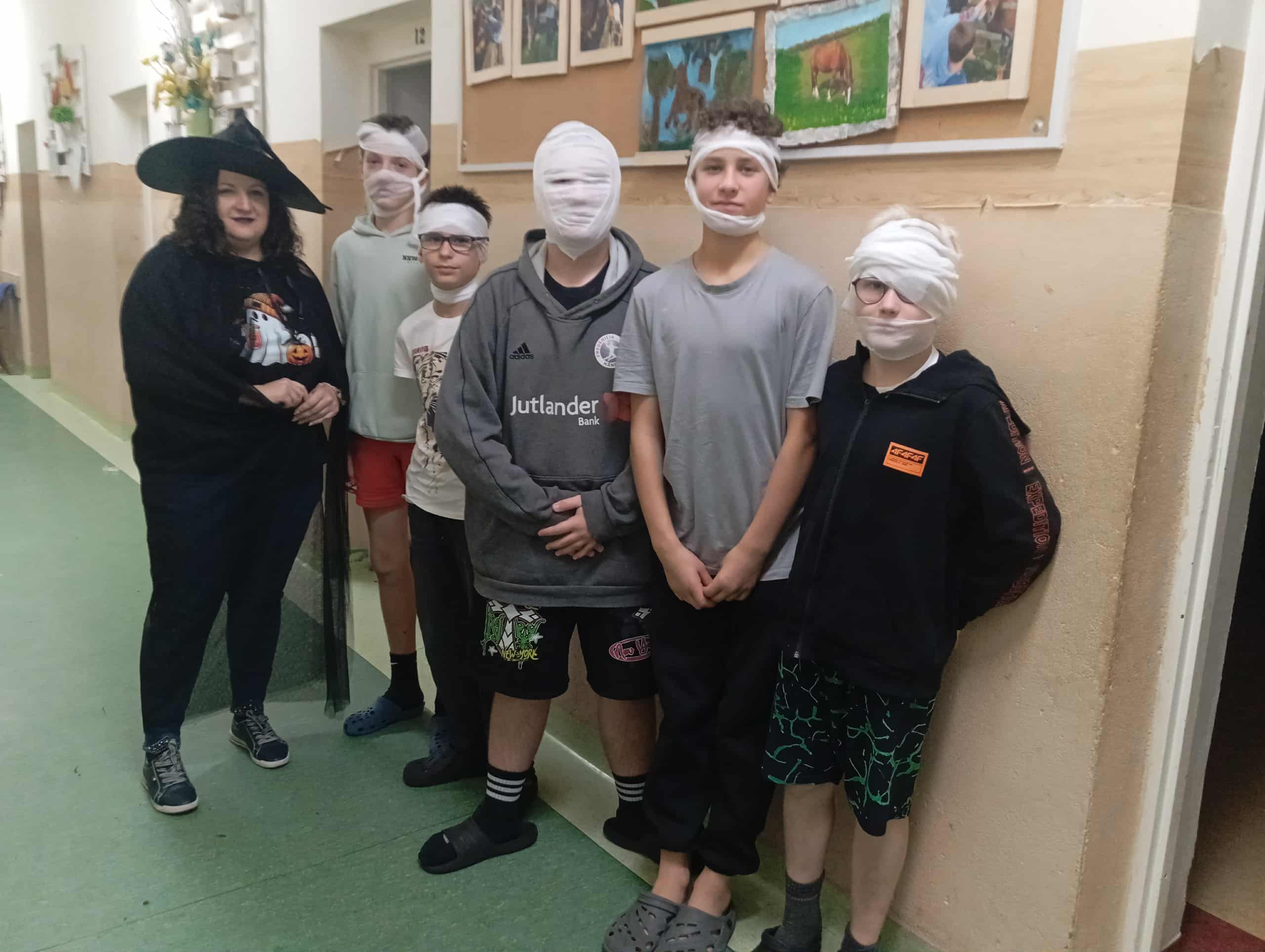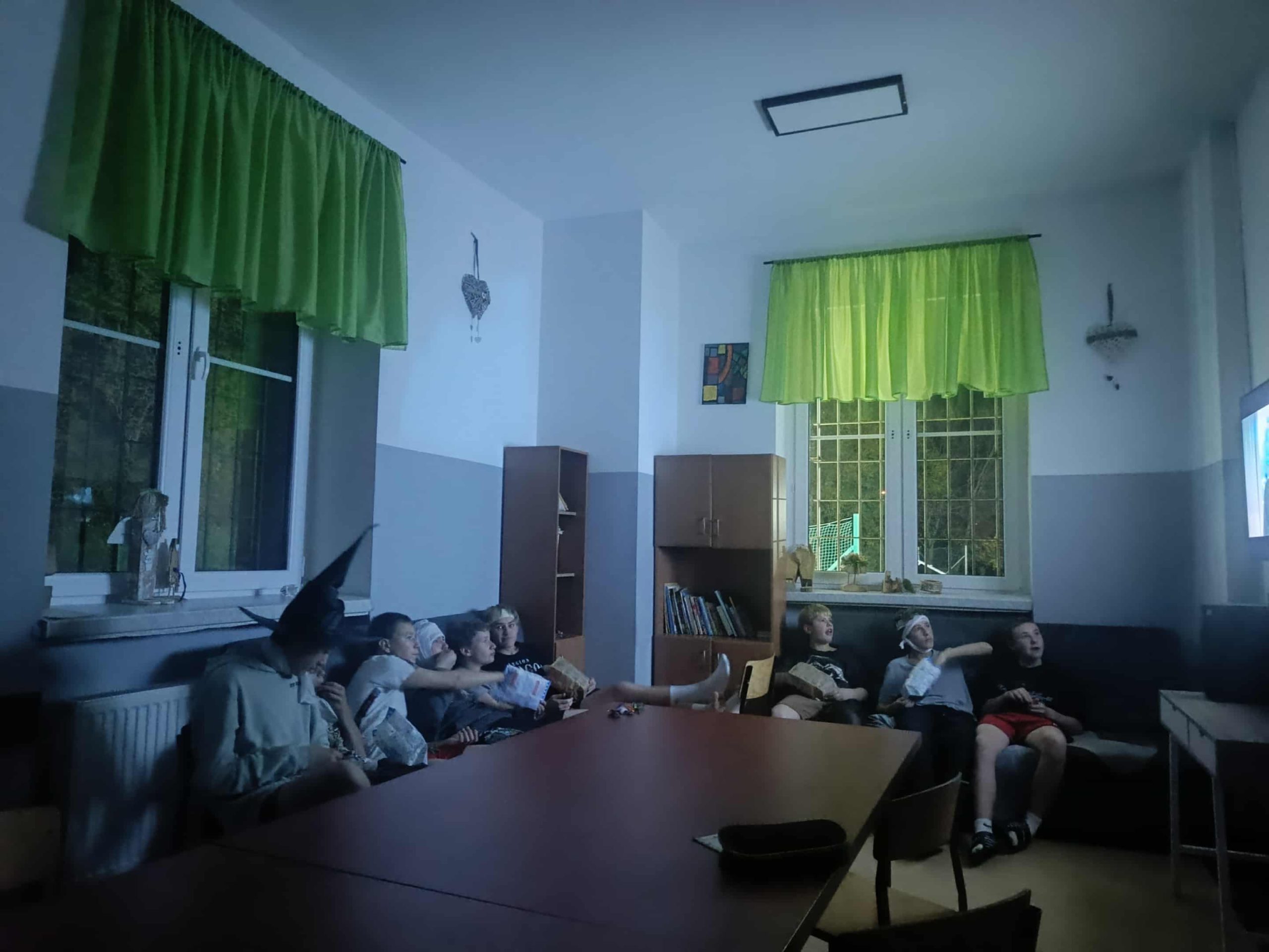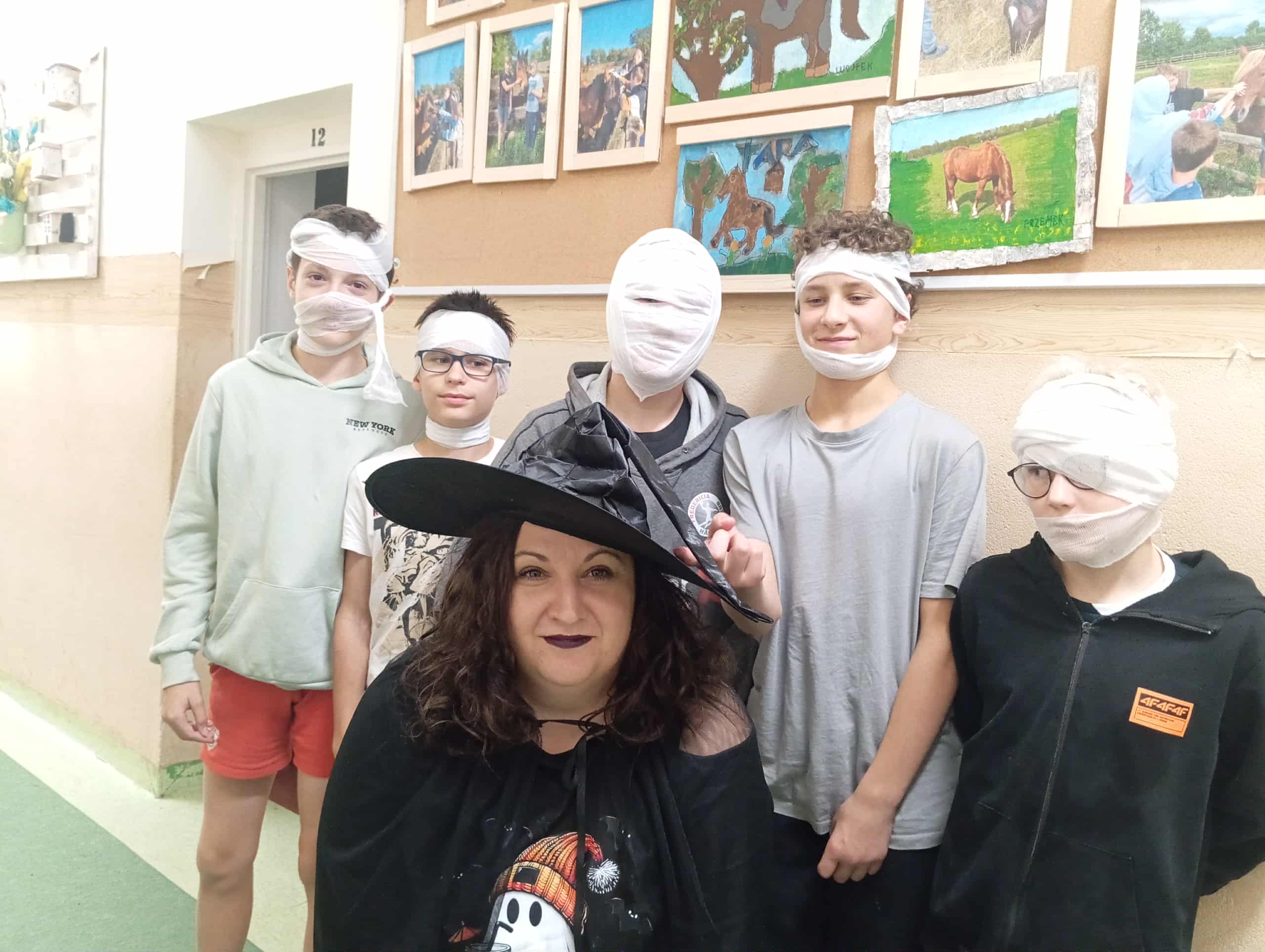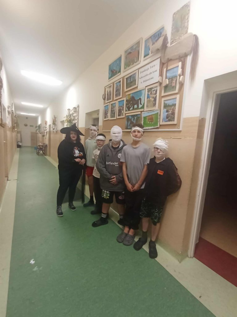 Już od popołudnia dało się wyczuć atmosferę tajemniczości – na korytarzach pojawiły się mroczne postacie, a wśród nich m.in. wiedźma z czarnym kapeluszem oraz grupka mumii owiniętych bandażami. Kreatywność uczestników jak zawsze nie zawiodła – każdy przebrał się z pomysłem i zaangażowaniem. Po wspólnej sesji zdjęciowej przyszedł czas na chwilę relaksu – odbył się Halloweenowy seans filmowy, podczas którego uczniowie mogli obejrzeć klimatyczny film w duchu tego święta. Oczywiście nie zabrakło także słodkości – w końcu hasło „Słodycze albo psikus!” zobowiązuje!