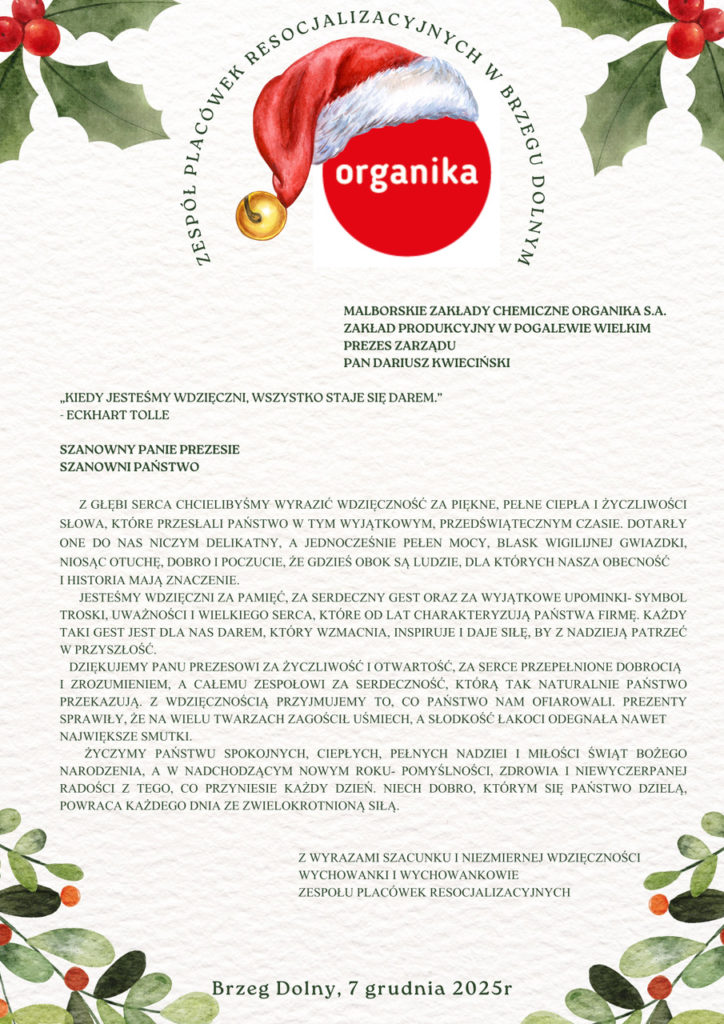 Jak co roku o tej porze wyglądamy przez okno i wypatrujemy oczekiwanego gościa. Kogoś kto przynosi radość i uśmiech na każdej twarzy, tych młodszych i nieco starszych. Tak, tak mowa o św. Mikołaju. Wiemy, że musi dotrzeć do wszystkich, dlatego czasami trzeba cierpliwie poczekać. W tym roku pojawił się u nas w niedzielę, gdy zmierzch ogarnął już nasz ośrodek. Przybył na każdą grupę i obdarował słodkościami każdą i każdego z nas. Może nie zawsze udawało nam się być grzecznymi ale „wiara innych w nas” staje się motywacją do stawania się lepszym i odkrywania w sobie i innych ogromnych pokładów dobra. W tym roku w rolę Mikołaja wcieliły się Malborskie Zakłady Chemiczne ORGANIKA SA – Zakład Produkcyjny w Pogalewie Wielkim. To już kolejny raz gdy możemy liczyć na Wasze wsparcie i ogromną życzliwość. Za każdym razem nasze „chemiczne wiązania” stają się co raz mocniejsze i mocniej zapadają w serce i stają się jego trwałym nierozerwalnym elementem. Za tymi wiązaniami stoją konkretni ludzie, których należy wymienić z imienia i nazwiska, gdyż to Oni dbają o prawidłowy „proces” tworzenia DOBRA. Dziękujemy zatem: Panu Dariuszowi Kwiecińskiemu – Prezesowi Zarządu Malborskich Zakładów Chemicznych ORGANIKA S.A.‚ Pani Dorocie Błaszak – HR Menager oraz Pani Katarzynie Zimnej- specjaliście ds kadr i płac, która koordynowała wszelkie poczynania św. Mikołaja. Dobro, którego od Was doświadczamy na pewno zaowocuje w naszym dorastaniu do dorosłego i odpowiedzialnego życia.