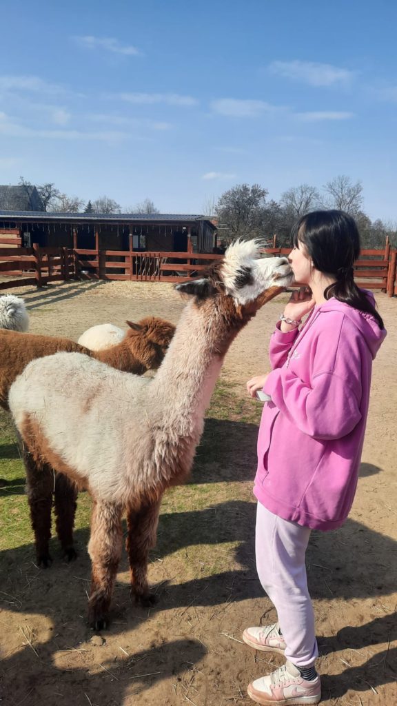 11 marca 2026r. w  słoneczne , prawie  wiosenne  południe  Rancho Alpak odwiedziła większa grupa młodzieży. Takie spotkania łączą edukację z elementami alpakoterapii , która pomaga w redukcji stresu, budowaniu empatii oraz nauce odpowiedzialności. Kilka dziewcząt po raz pierwszy miały kontakt z alpakami . Właścicielka rancha Pani Dorota  zapoznała wychowanki z zasadami kontaktu z alpakami. Bezpośrednia  relacja  polegała na karmieniu  specjalnie przygotowaną paszą lub marchewką oraz możliwością  pogłaskania i przytulenia zwierząt. Prelekcja edukacyjna  zaowocowała  przełamaniem bariery lęku , strachu . Pojawił się na ich twarzach uśmiech i zadowolenie. Taka forma współpracy jest możliwa w ramach prowadzonej  w Placówce innowacji pedagogicznej. Kontakt z alpakami uczy cierpliwości (zwierzęta te nie lubią gwałtownych ruchów) , odpowiedzialności za inną istotę oraz regulacji emocji – alpaki doskonale wyczuwają napięcie i stres człowieka. Wychowanki i wychowankowie zadbali także o prace porządkowe i estetyczne na terenie rancha. Jagoda z Julią sadziły do skrzynek kwiatki . Marlena z Wiktorią ,Leną i Patrycją sprzątały zagrody alpak. Chłopcy : Karol , Bartek ,Patryk ,Adrian przygotowywali miejsce na budowę kolejnych pomieszczeń dla alpak a Sebastian z Kacprem standartowo sprzątali zagrodę dla koni. Adam , który był dzisiaj nieobecny wykonał ołówkiem rysunek alpaki – prezent dla Pani Doroty. Czas relaksu zakończył się wyśmienitą pizzą i kiełbasami z grilla. To był doskonały  sposób na wyciszenie i kontakt z naturą.. To miejsce oferuje unikalne doświadczenia , które tak bardzo potrzebują nasi podopieczni. Wszystkim bardzo serdecznie dziękujemy za wzorową postawę . Jesteście naprawdę wspaniali.