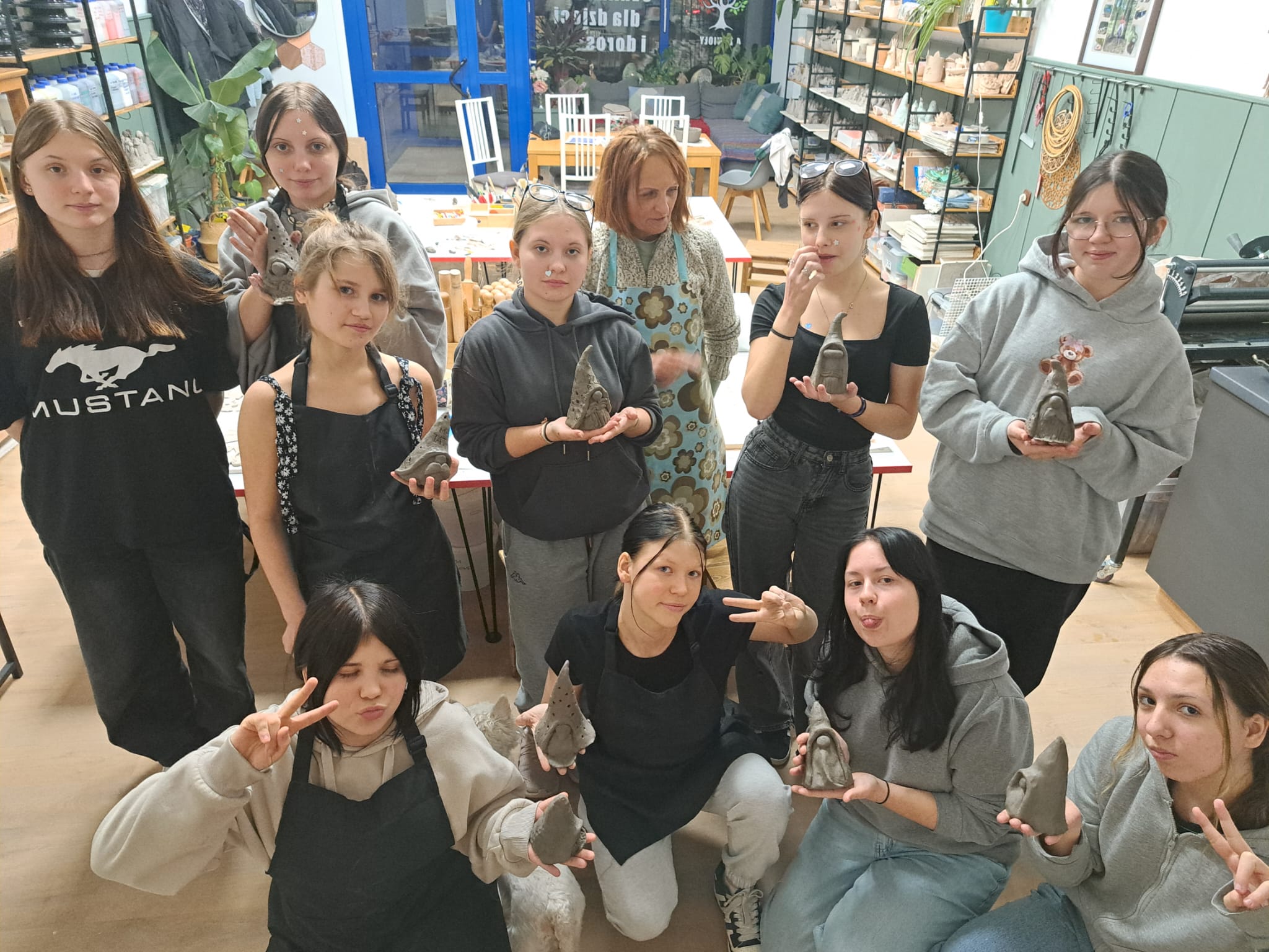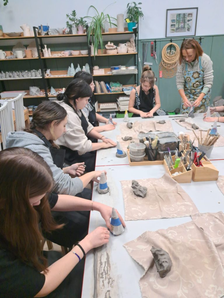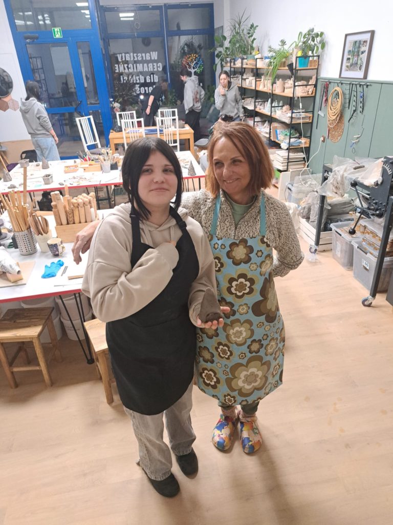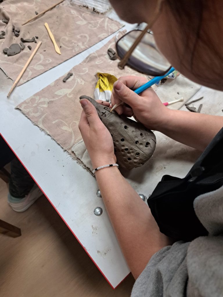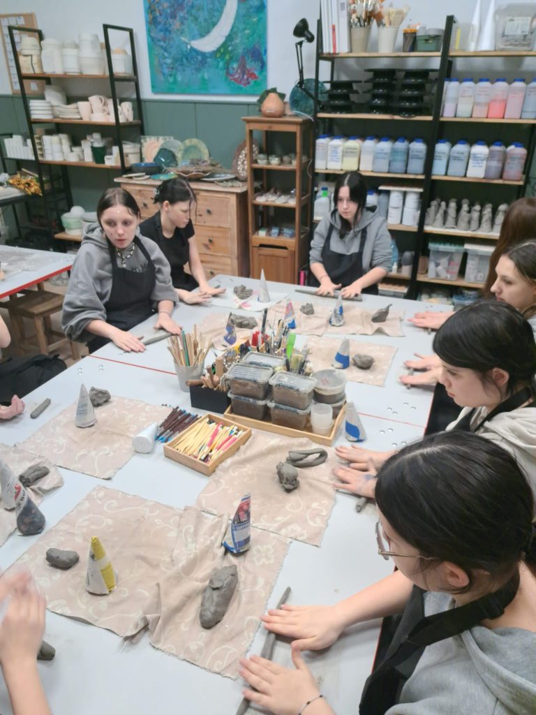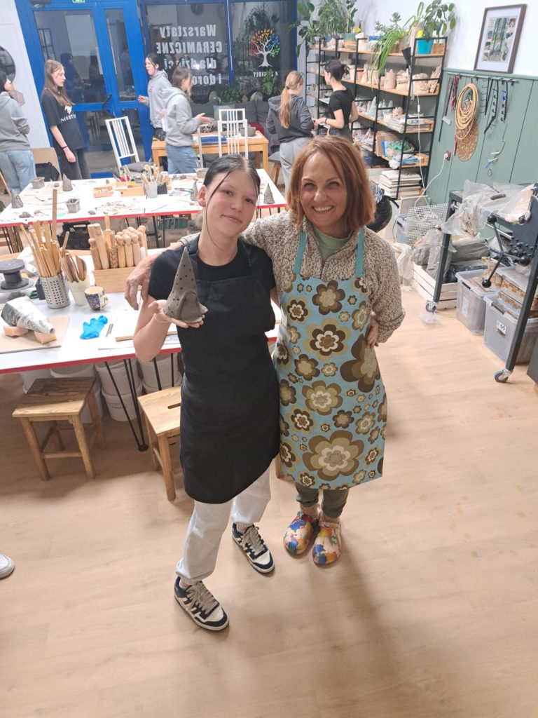 Dnia 22.11.2025r. w godzinach popołudniowych odwiedziliśmy pracownię Ceramiczną „4 Żywioły”, dzięki uprzejmości p. Edyty Górnickiej, mogliśmy uczestniczyć w warsztatach ceramicznych wraz z grupą III Młodzieżowego Ośrodka Wychowawczego Nr 2. Wychowanki wykonywały krasnale z gliny już w tematyce świątecznej. Ręcznie lepione figurki były pełne charakteru i humoru. Miały przysadziste sylwetki, spiczaste czapki, duże nosy i bujne brody. Po wyschnięciu i wypale można je będzie pokryć szkliwem – matowym lub błyszczącym – co nada im koloru i trwałości. Każdy krasnal będzie niepowtarzalny, bo powstał z odcisku dłoni twórcy i spontanicznych decyzji podczas lepienia. Przy pracy towarzyszyła nam przemiła atmosfera, którą stworzyła sama pani prowadząca p. Edyta. Wychowanki były zachwycone, że mogły uczestniczyć w tak ciekawych zajęciach.