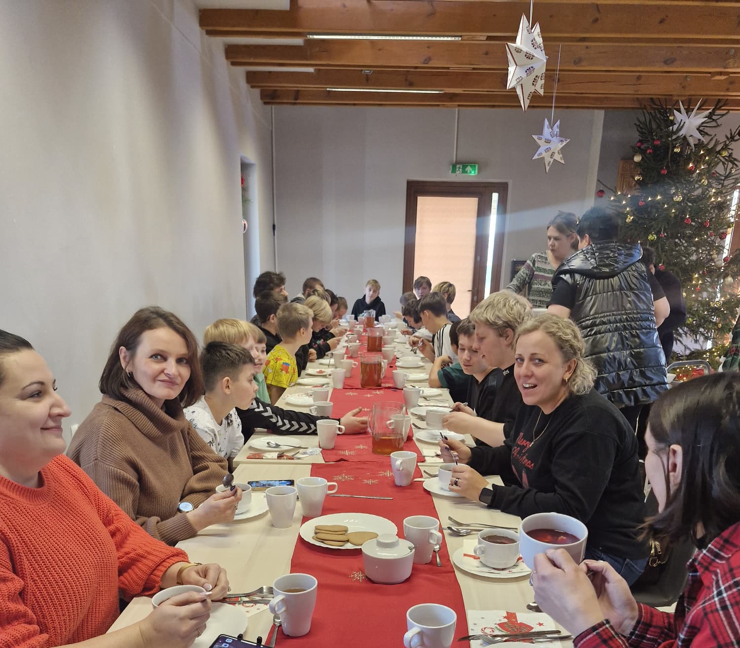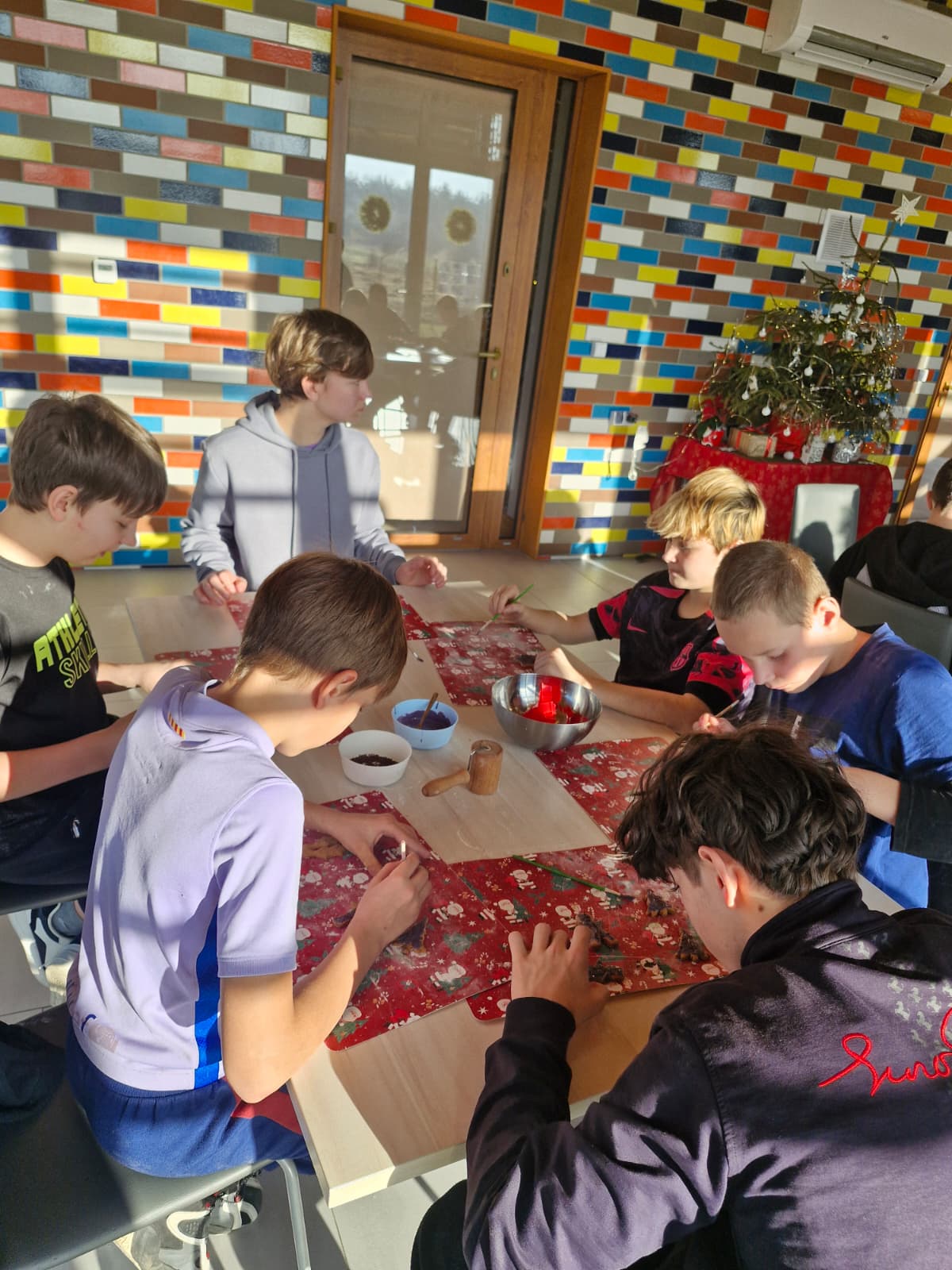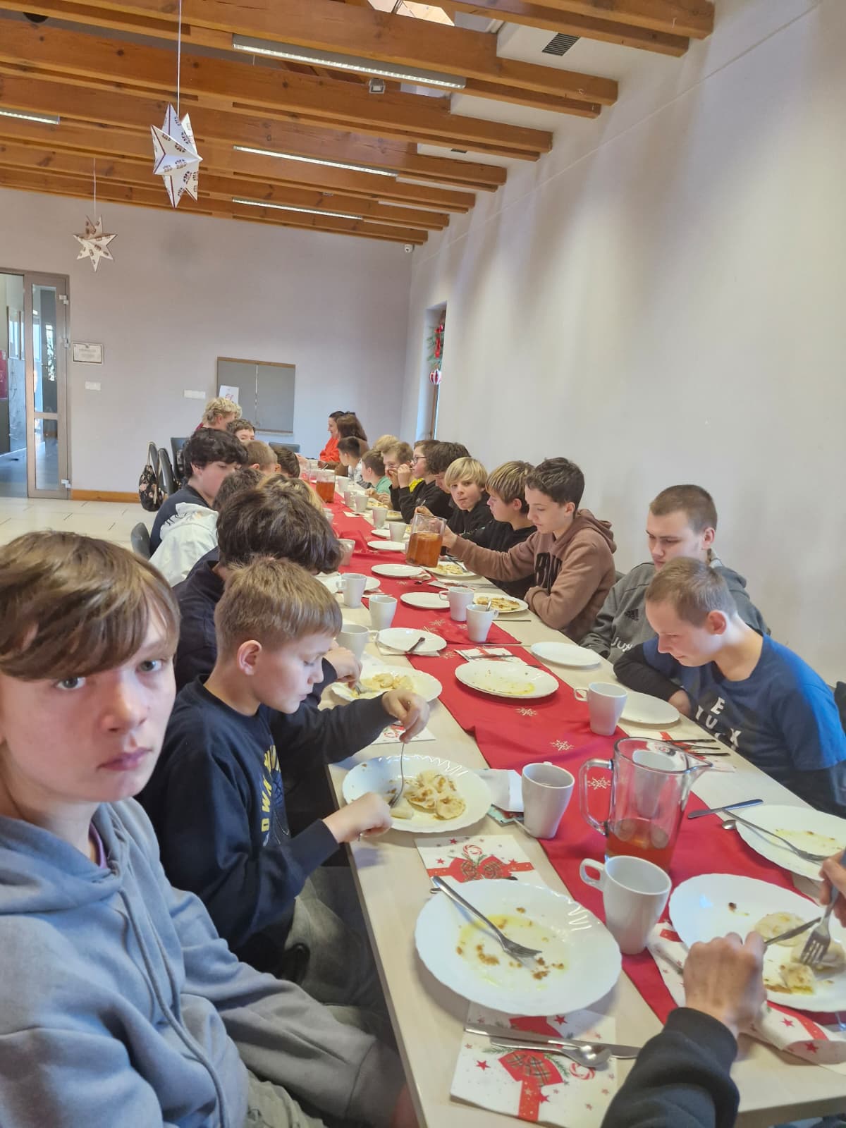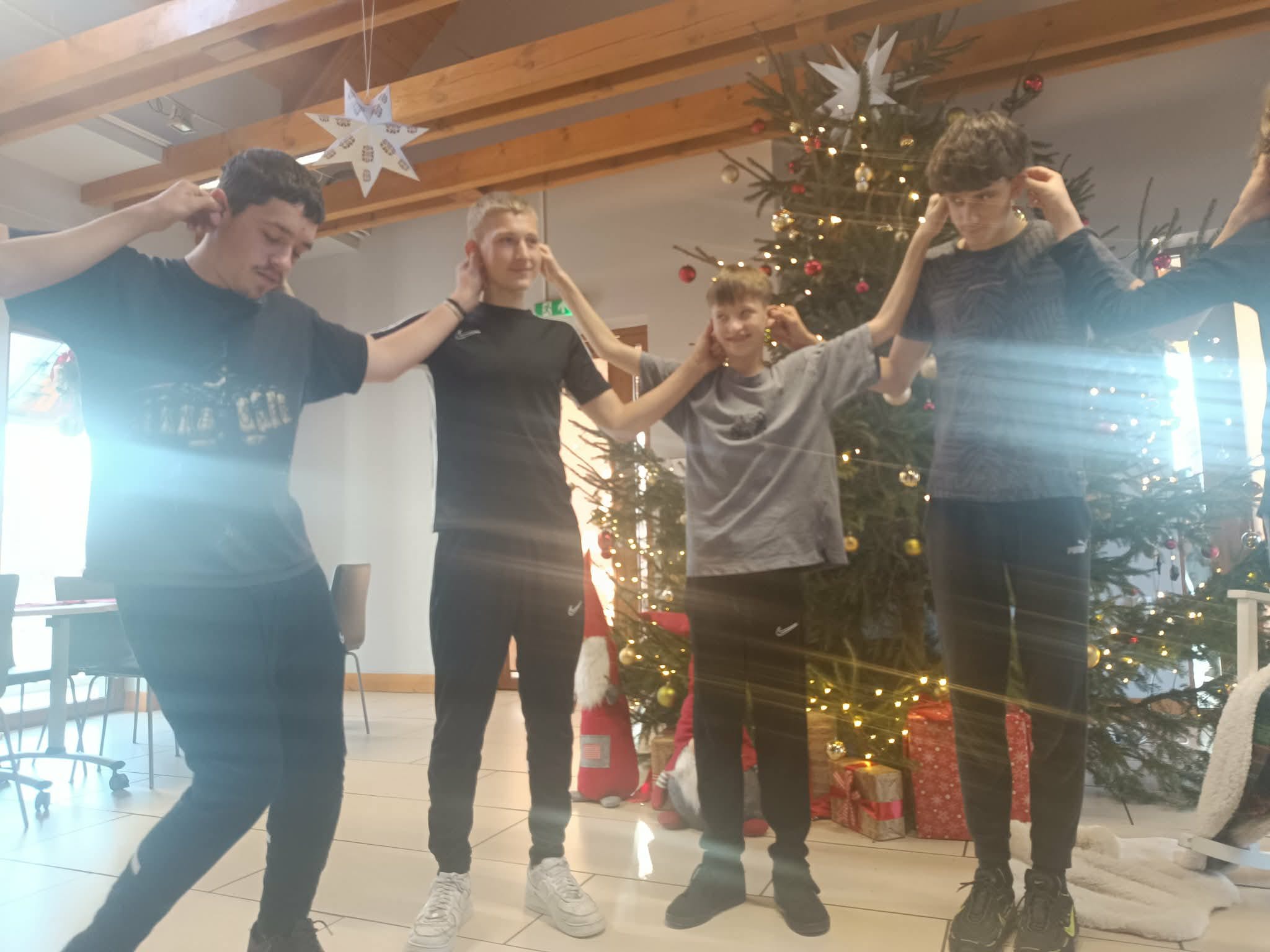 W dniu 18.12.2025r. Uczniowie Młodzieżowego Ośrodka Socjoterapii wybrali się wraz z opiekunami na wycieczkę do Regionalnego Ośrodka Edukacji Ekologicznej w Dziewinie. W trakcie wyjazdu chłopcy wzięli udział w warsztatach integracyjnych, gdzie podczas doskonałej zabawy i w radosnej, świątecznej atmosferze mieli możliwość zintegrować się ze sobą, zacieśnić więzi, a przede wszystkim dobrze bawić. Chłopcy wraz z opiekunami doskonalili swoje umiejętności taneczne, brali udział w świątecznym quizie, a także stoczyli bitwę na ,,śnieżki”. Uśmiechy z ust uczestników warsztatów. Nie schodziły, ani na moment, a nawet najwięksi początkowo maruderzy dołączali do zabawy. W drugiej części warsztatów chłopcy robili pyszne pierniki, które po upieczeniu samodzielnie dekorowali. Warto wspomnieć, że pierniki smakowały i wyglądały tak apetycznie, iż znaczna część z nich została zjedzona już na miejscu i pomimo początkowych planów nie dojechała nawet do Placówki(!). Bardzo dużą niespodzianką dla chłopców była także wizyta Świętego Mikołaja z drobnym upominkiem, ale chyba nie ma się co dziwić w końcu nasi uczniowie to zazwyczaj bardzo grzeczne dzieci. Na koniec mieliśmy możliwość spróbowania pysznego barszczu z uszkami, pierogów, pasztecików i przepysznych deserków. Podsumowując, wycieczka była niezwykle udana i obfitowała w momenty pełne śmiechu i świątecznej magii.